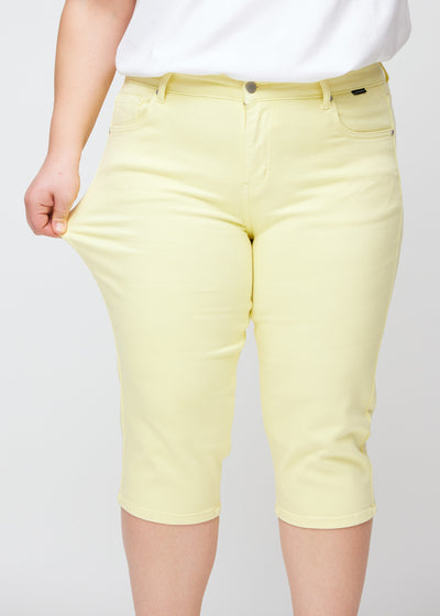 Lysegule slim capris, farve Lemonades, med tætsiddende pasform og længde lige under knæet – set forfra på plus-size model.